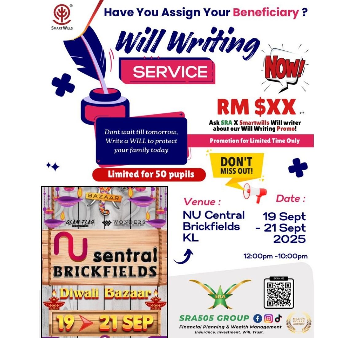 9月19日至21日,Smartwills 将亮相 Nu Sentral Diwali Bazaar,带来线上遗嘱撰写与咨询服务。限时优惠,先到先得!